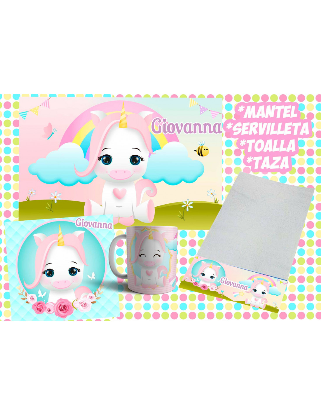 TODOS LOS DISEÑOS DISPONIBLES PARA QUE ARMES LOS SET MÁS LINDOS. INCLUYE EL MOLDE DEL MANTEL, TOALLA, SERVILLETA Y TAZA. ADEMAS INCLUYE FUENTE,FONDOS Y DIBUJOS DE ACUERDO A CADA PERSONAJE TAMBIÉN INCLUYE EL MOCKUP PARA QUE LO PROMOCIONES EN TU PAGINA.