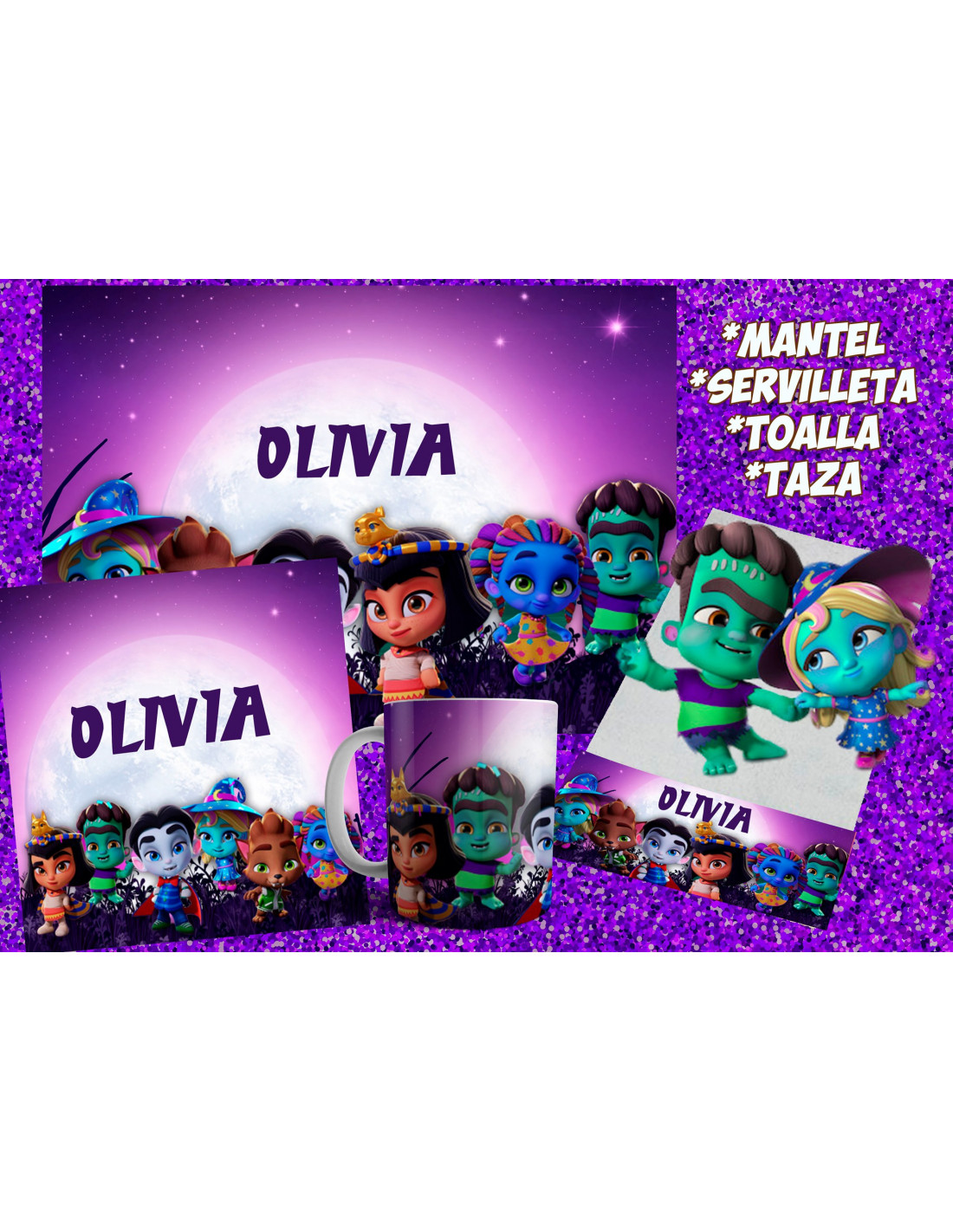 INCLUYE LA PLANTILLA PARA: *TAZA *INDIVIDUAL *TOALLA *SERVILLETA *CANTIMPLORA *TUPPER *MOCHILITA ADEMAS FONDO-DIBUJOS- LETRA PARA QUE LO ARMES EN LO QUE QUIERAS